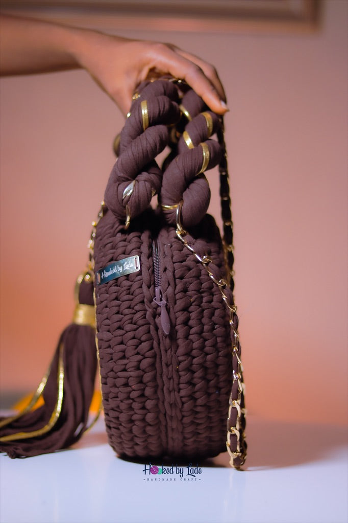 Color; Chocolate brown yarn garnished with Metallic Gold Trim.