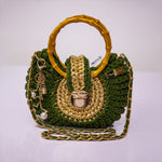 Color; Golden metallic circle/army green body finishing for an autumn look with bamboo handles and gold accessories as seen