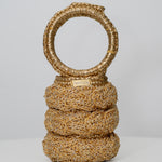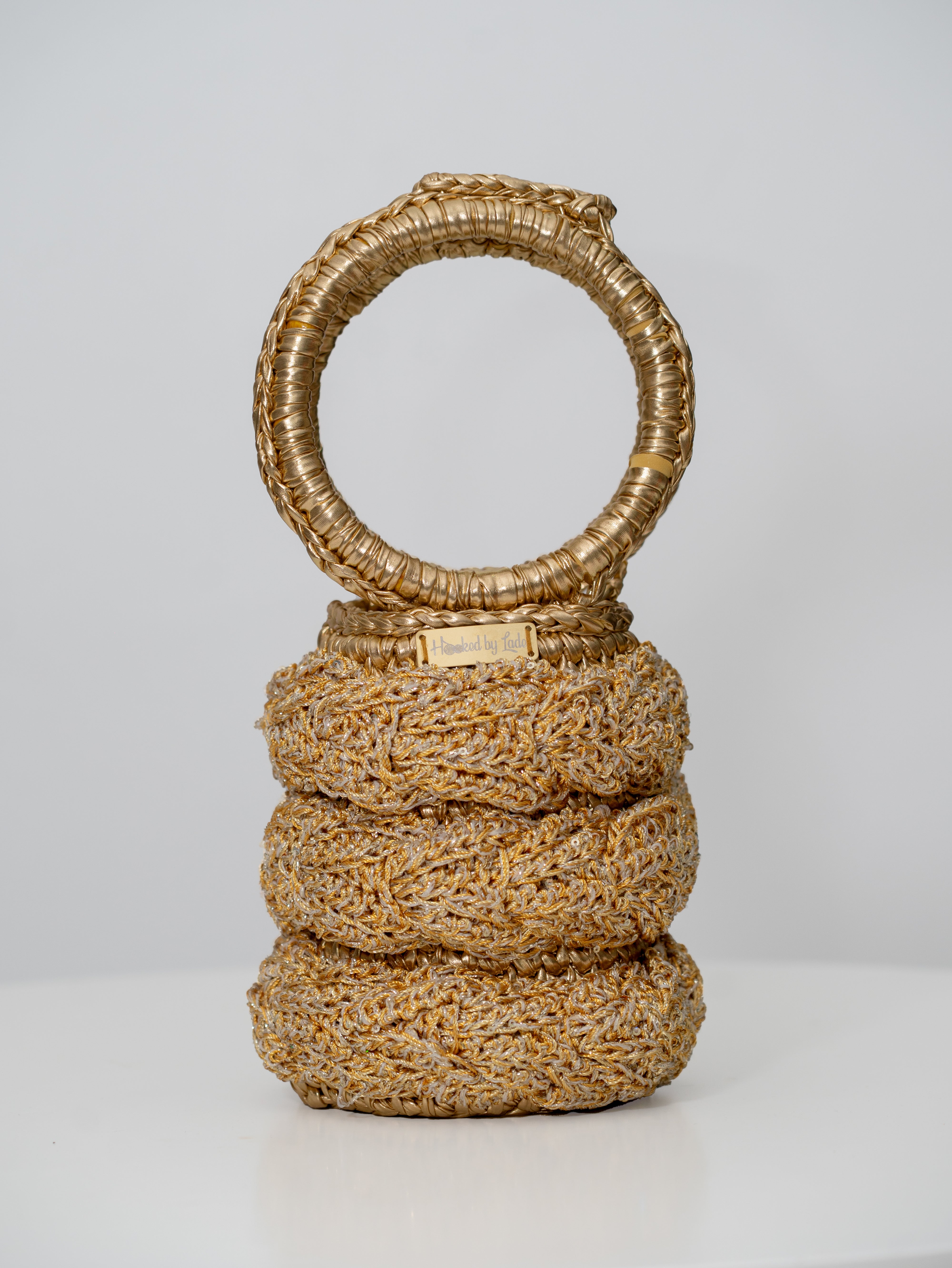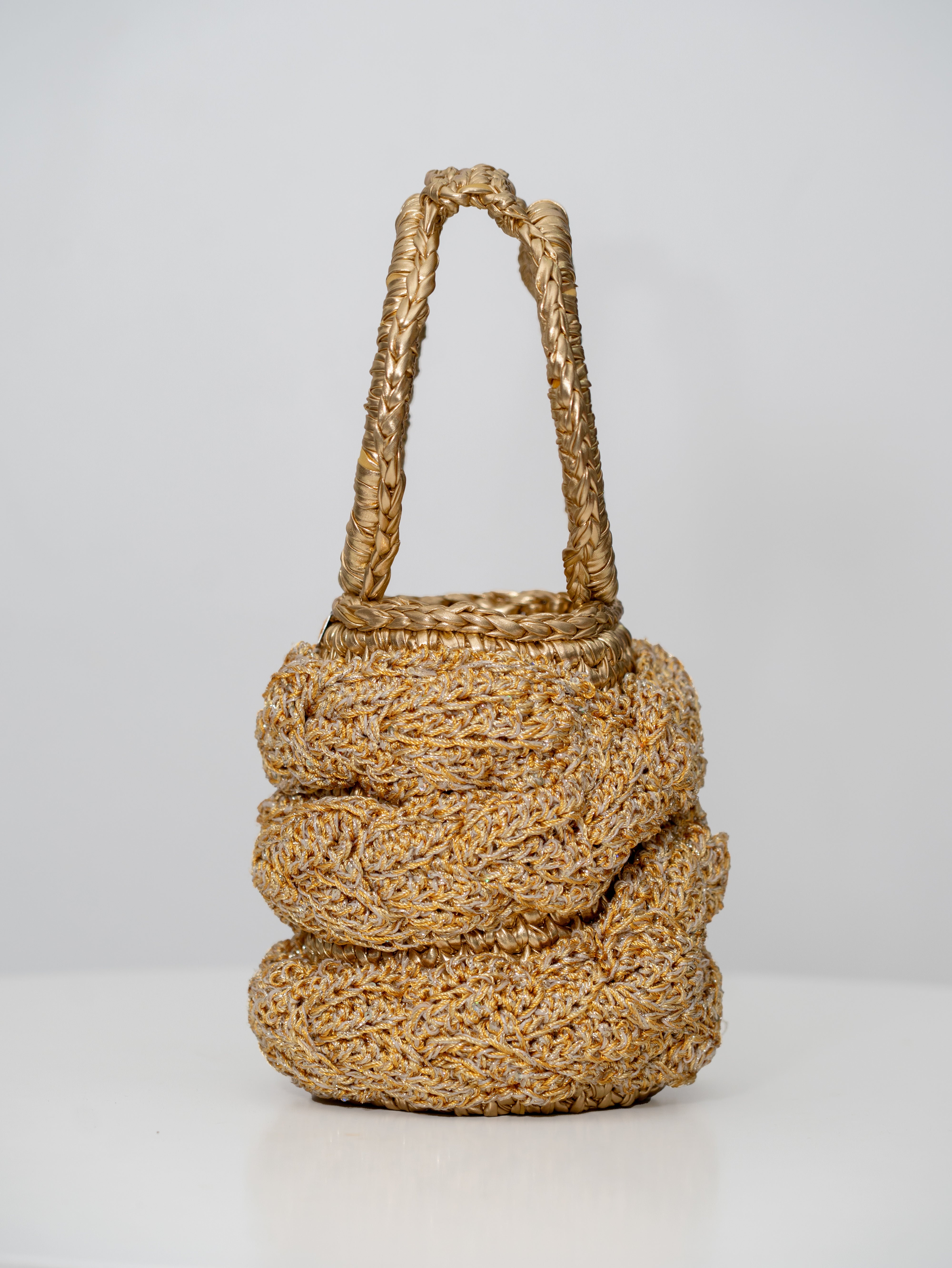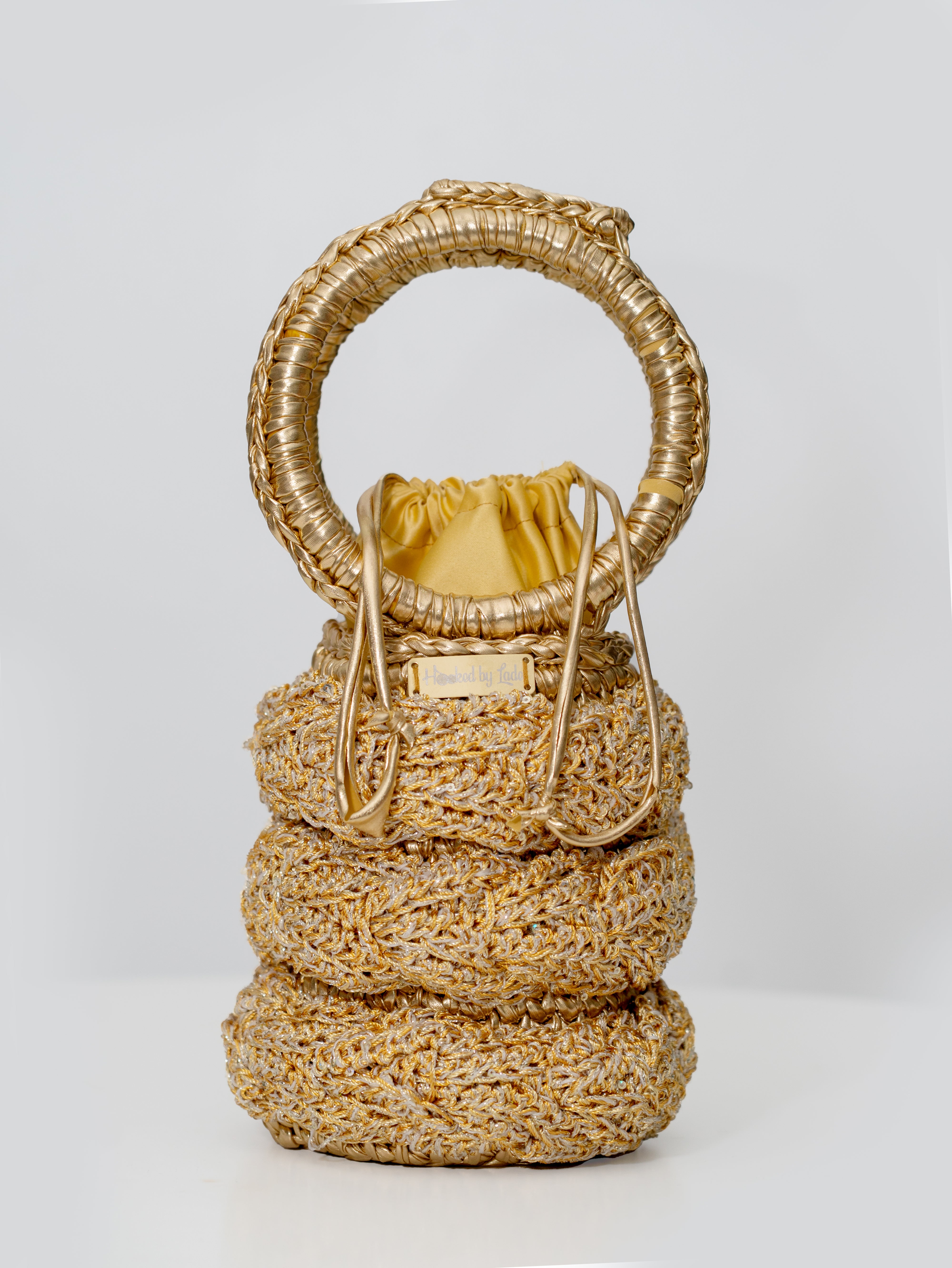 Color: Metallic gold bucket bag+Glittery gold vines wrapped around with bamboo handles covered up in Gold metallic yarn as seen. It comes with a Gold-themed inner pouch