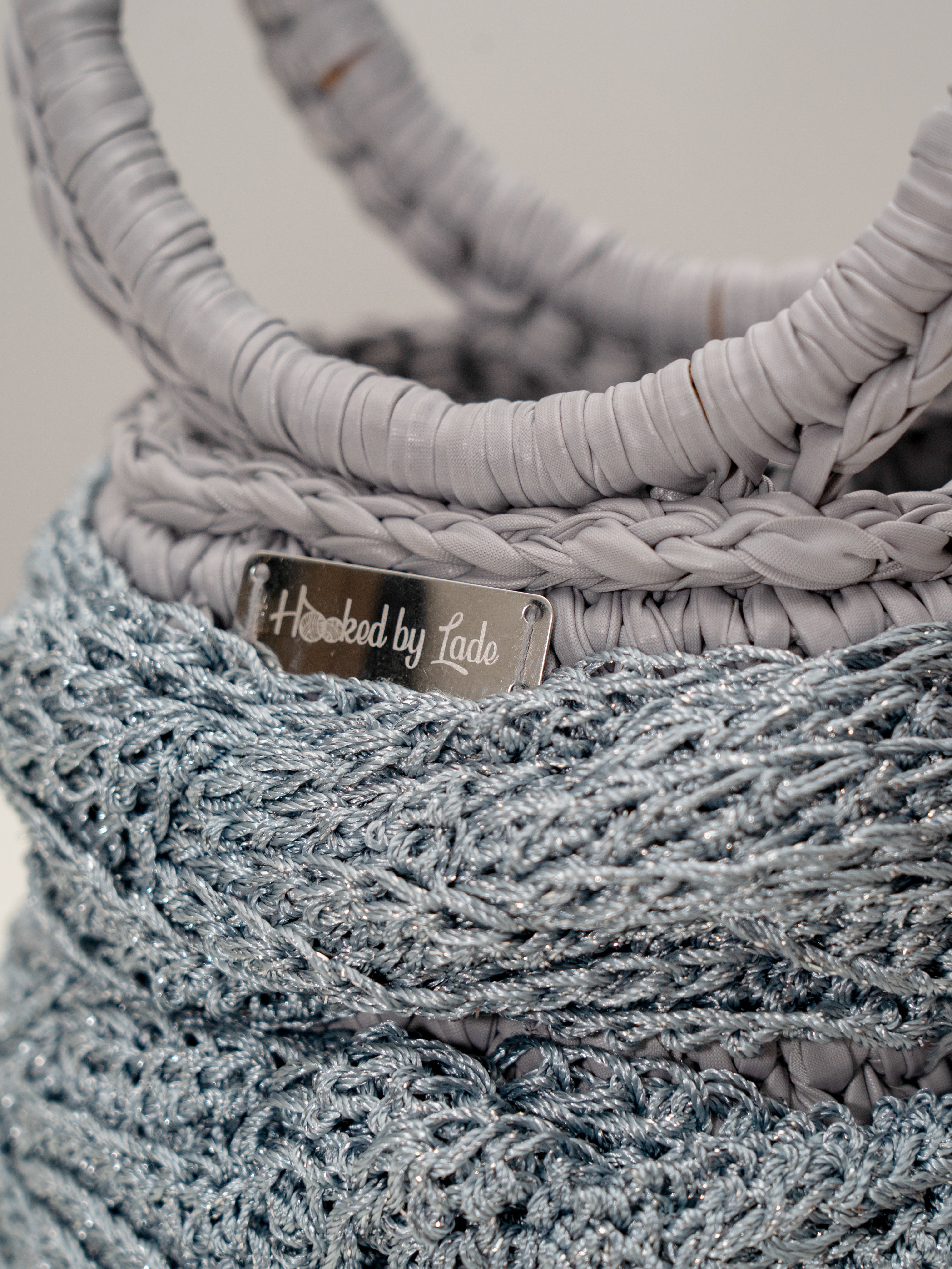 Color: Grey bucket bag+Glittery silver vines wrapped around with bamboo handles covered up in Grey leather yarn as seen. It comes with a silver-themed inner pouch