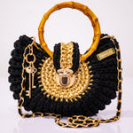 Color; Golden metallic circle/Black tshirt yarn body finishing for an autumn look with bamboo handles and gold accessories as seen