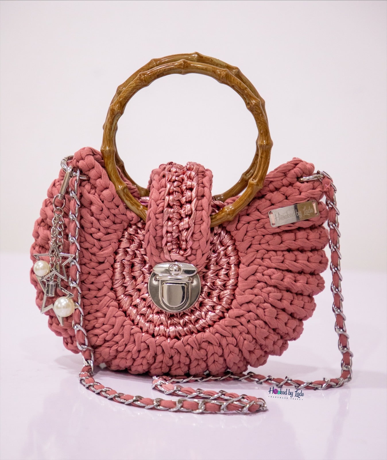 Color; Blush metallic circle/Blush pink tshirt yarn body finishing for an autumn look with bamboo handles and gold accessories as seen